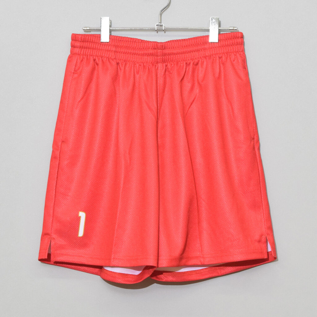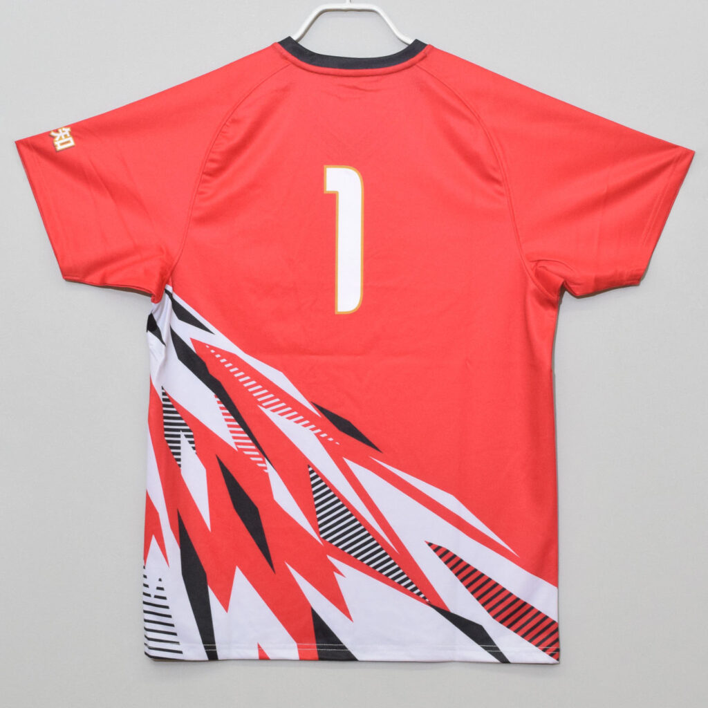 斜めに入った山のモチーフと情熱的なレッドが印象的なバレーユニフォーム
