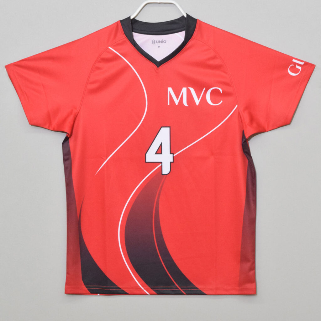 赤に映える白と黒の曲線が優雅で繊細な印象のバレーユニフォーム